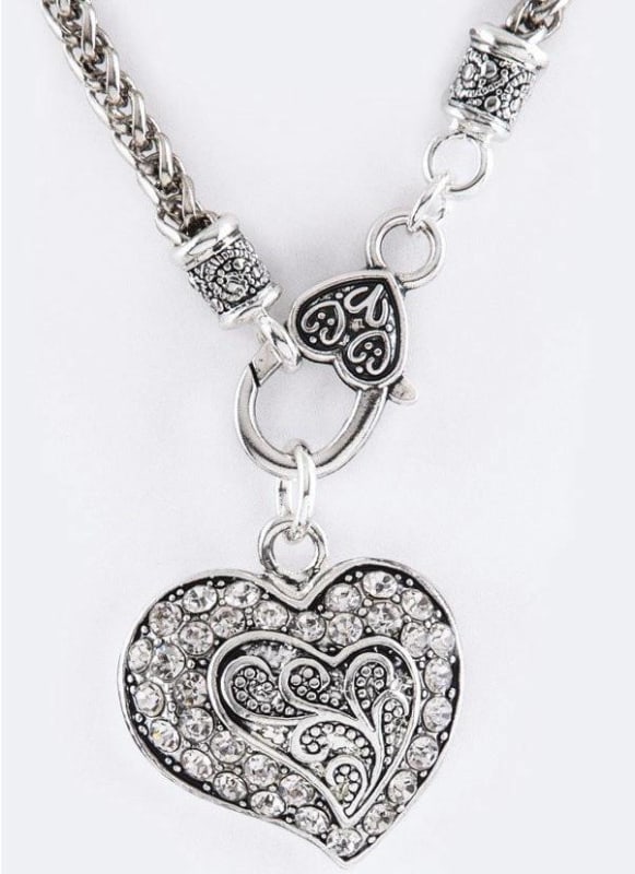 Love the playfulness of this crystal embellished heart necklace.  Save it for yourself to give it to your sweetheart.  Heart shaped necklaces symbolizes love, friendship, and deep affection-- perfect as a gift for someone you love or just a special gift for yourself.