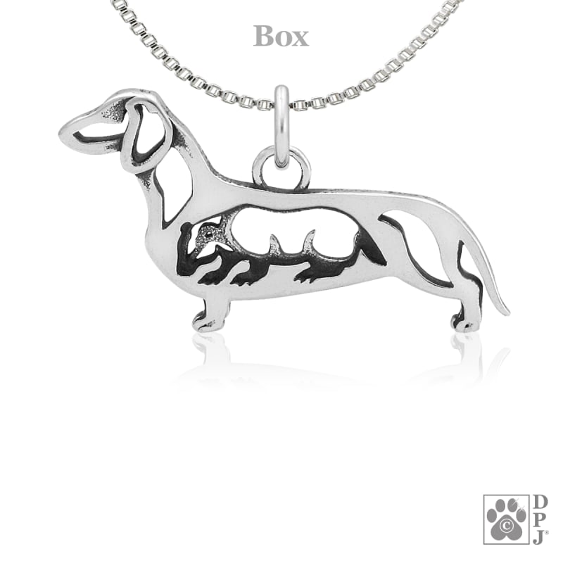 Pendant Size: 3/4” tall X 1-3/8” wide Sterling Silver Dachshund dog jewelry designs are copyrighted by Dazzling Paws Jewelry LLC.