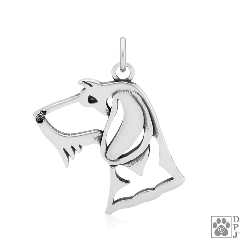 Our wirehaired Dachshund pendant carries its head held high with the distinctive eyebrows and beard that help animate an alert, bold expression which exemplifies confidence. The lines of this charm illustrate contrast and striking breed details. This Doxie’s ears are hard, moderate in length and slightly rounded yet set near the top of its head for a very balanced and characteristic face framing. The outline of our authentic wirehaired Dachshund charm is unmistakable. This Dachshund pendant is a very genuine Doxie reproduction! And if you like our Wirehaired, shop our Sterling Silver longhaired, smooth coated Dachshunds too!