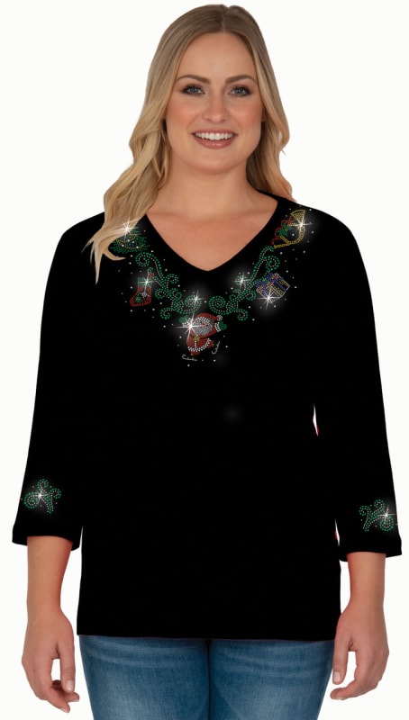 Santa on Sleigh W/Reindeer Rhinestone Top