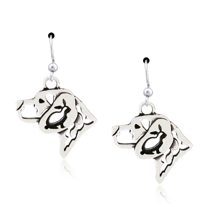 Our Beagle Head earrings show the Beagle’s straight and square muzzle with evidence of a generous sized and outstanding nose, great for gathering scent. You can imagine this beagle’s gentle dark eyes showing the sweet expression that melts every beagle owner’s heart, just as much as their funny antics. Any lifelike Beagle Head earrings would have those characteristic long, soft and “houndy” ears for trapping scent, but wait… take a closer look. There’s a rascally rabbit sitting still, trying to hide from our super scenting Beagle. These Beagle earrings are one of a kind for their unexpected, fun surprise cut out in the beagle’s ear. This collectable Beagle jewelry is a must have accessory for the Beagle lover!
